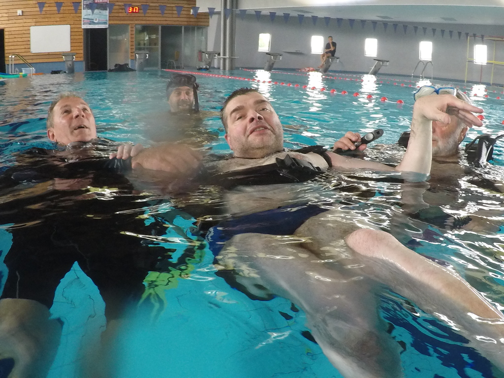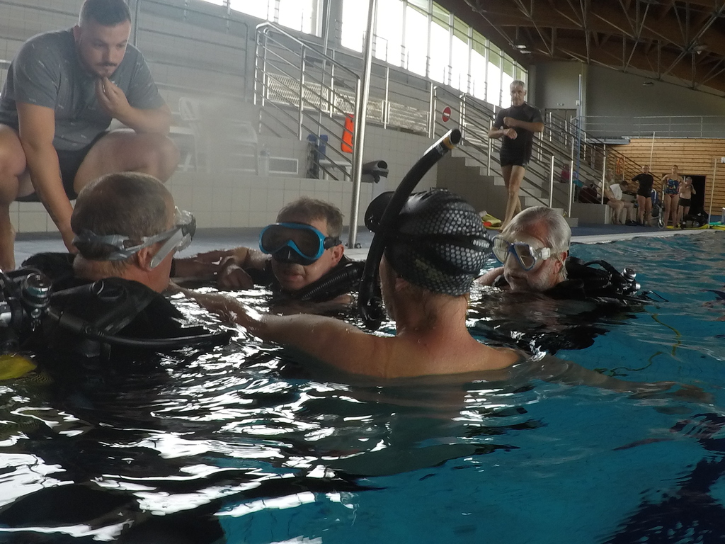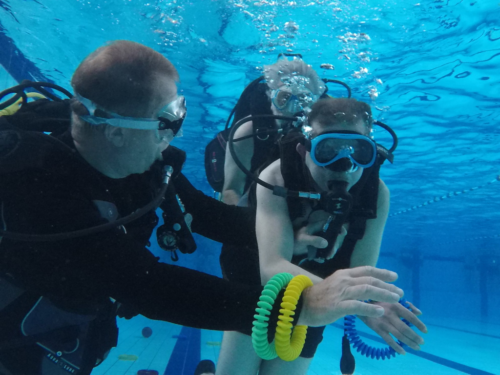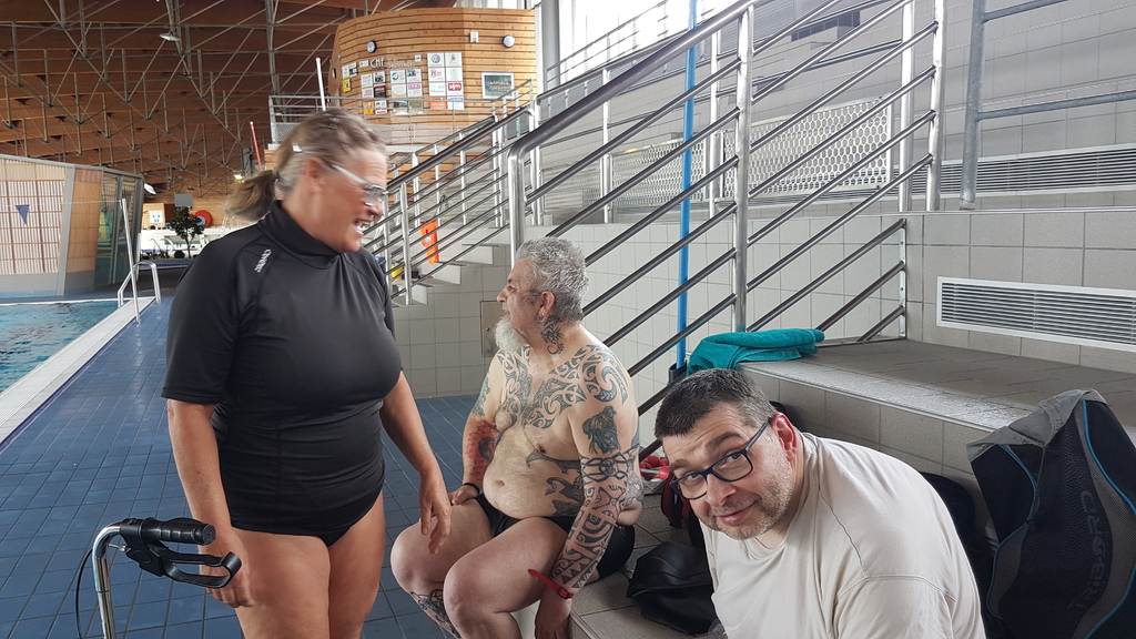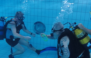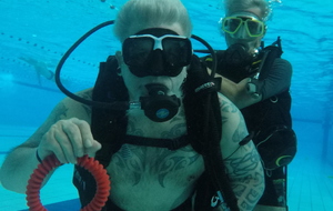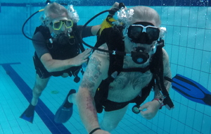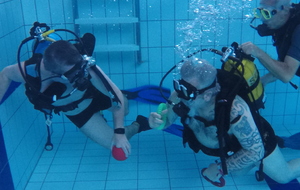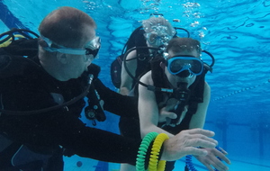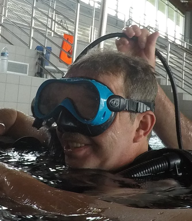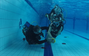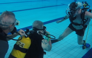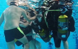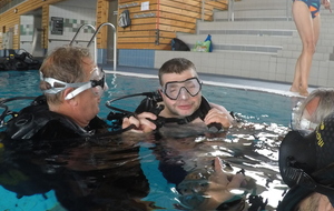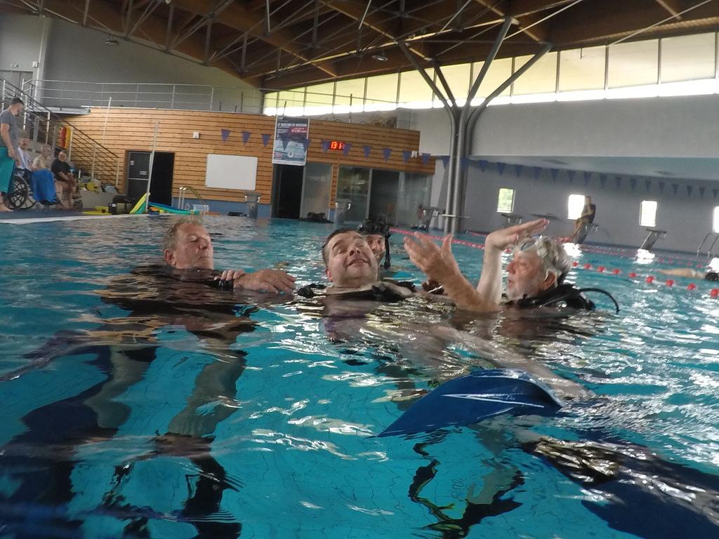 Le jeudi 23 mai David, Jean Michel et Hugues de l'Association Droit de Cité de Fougères ont réalisé un baptême de plongée adapté, en scaphandre, à l'Aquatis.