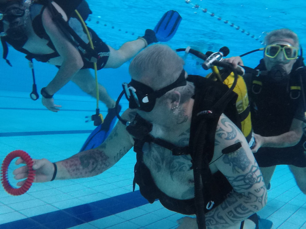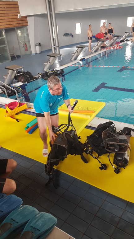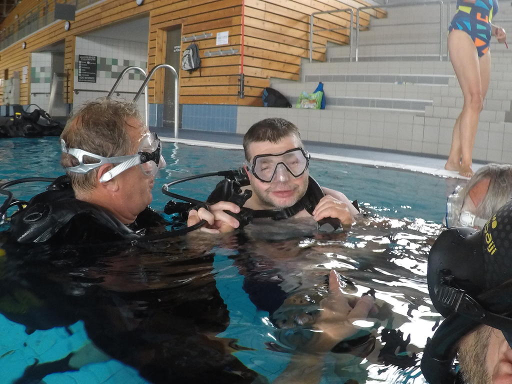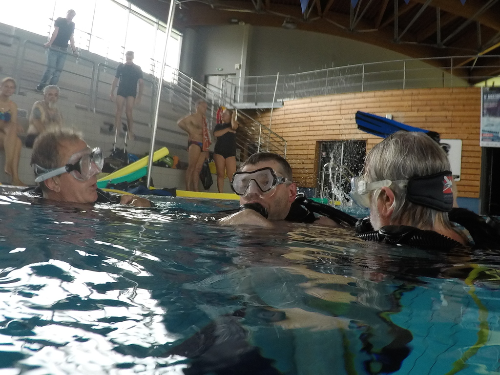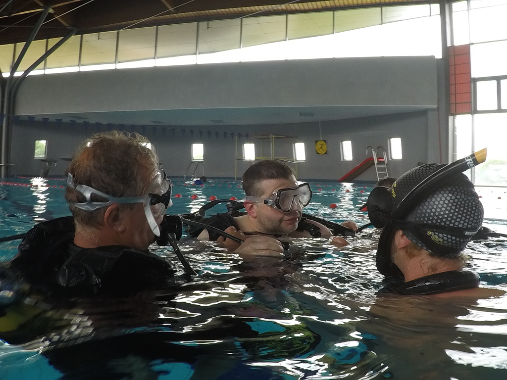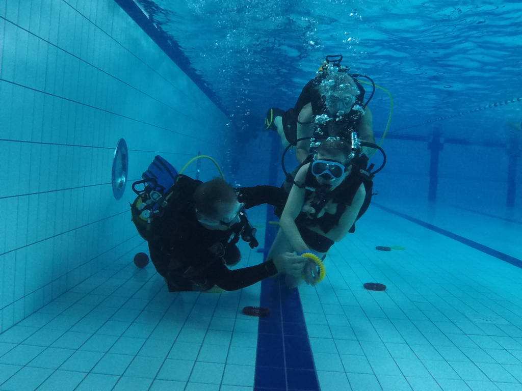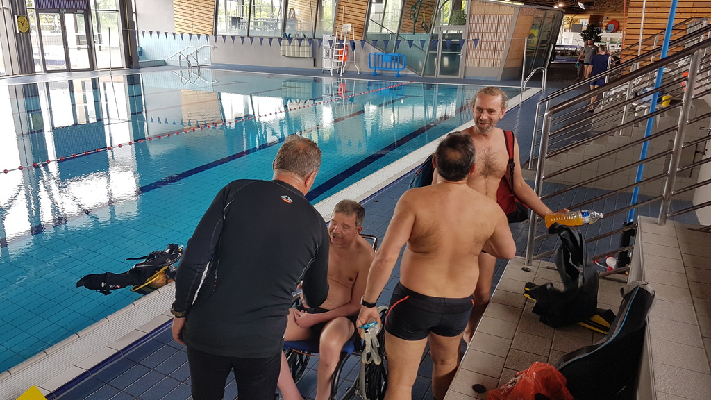 Le jeudi 23 mai David, Jean Michel et Hugues de l'Association Droit de Cité de Fougères ont réalisé un baptême de plongée adapté, en scaphandre, à l'Aquatis.