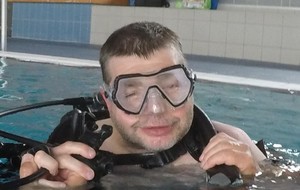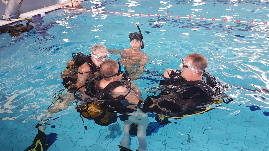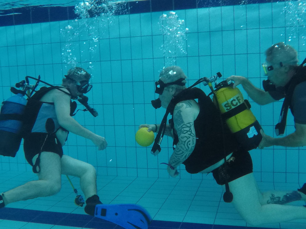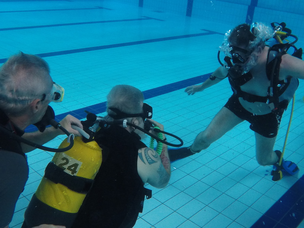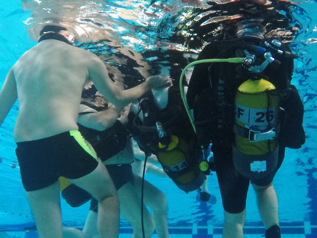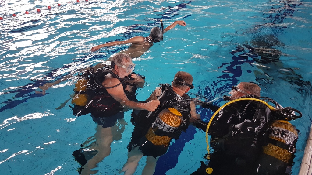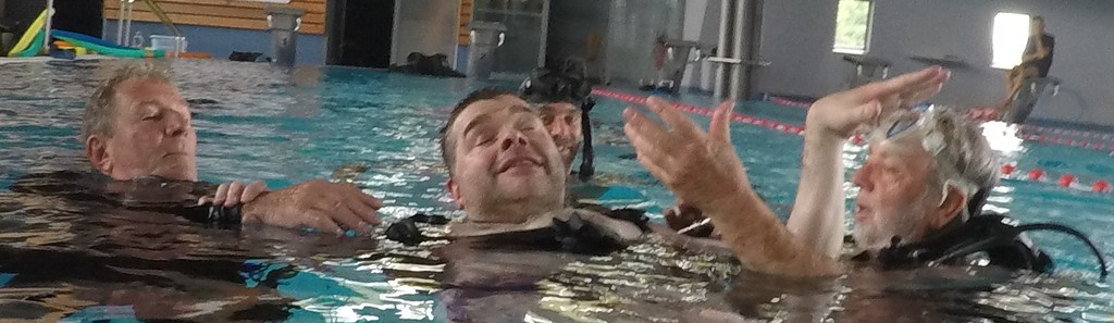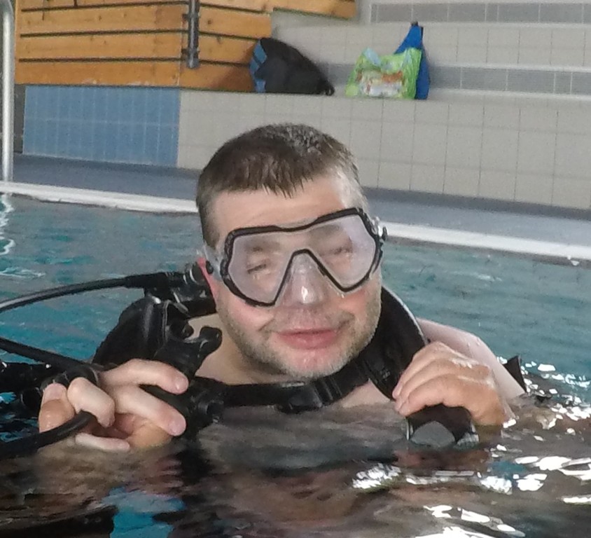 Le jeudi 23 mai David, Jean Michel et Hugues de l'Association Droit de Cité de Fougères ont réalisé un baptême de plongée adapté, en scaphandre, à l'Aquatis.
