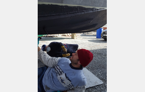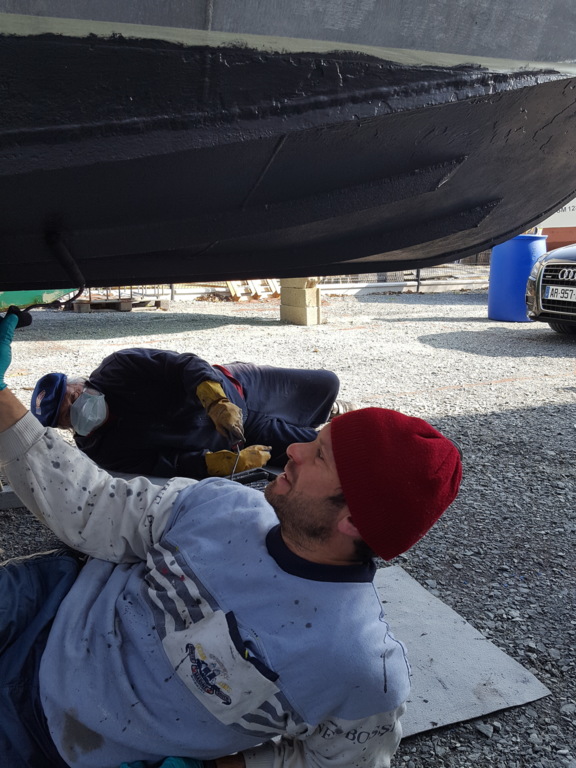 Le 28 mars, une nouvelle équipe composée de Yannick, Michel, Amand et Bernard a procédé à la mise de la deuxième couche et finalisé la préparation du bateau en vue de la mise à l'eau.