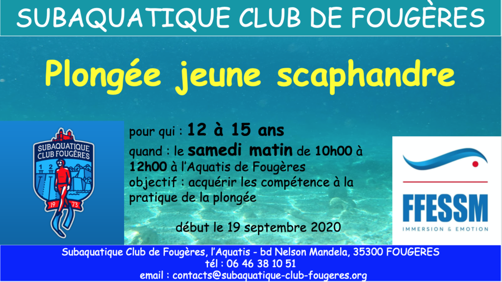 Les inscriptions pour la plongée jeune 12-15 sont ouvertes. L'adresse mail est inscrite sur l'affiche.